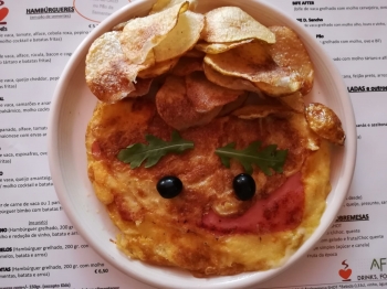 AgendarCourgette, pão, cebola, cogumelos, rúcula, queijo, ovo, molho picante e batata frita