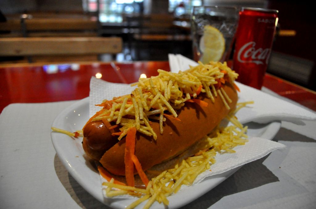 AgendarPão Cachorro, Salsicha, Chilli de Carne Picante com Bacon, Fiambre, Queijo Fundido e Batata Palha