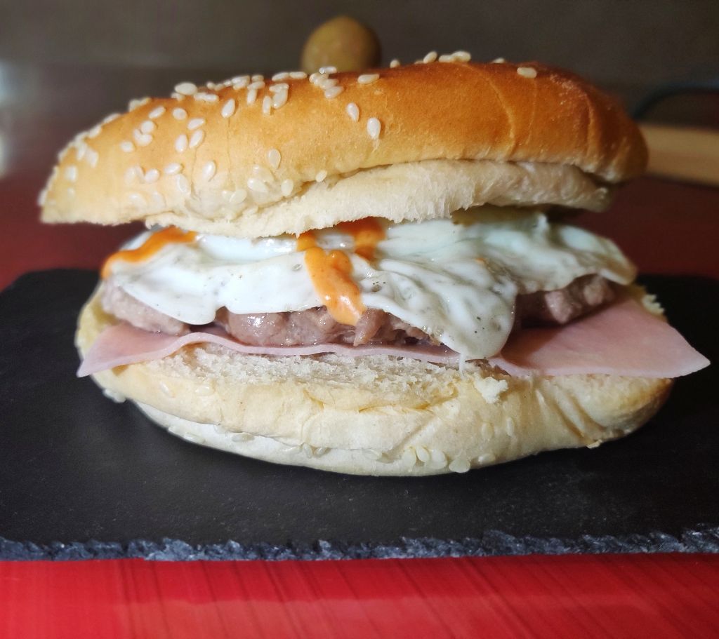 AgendarPão com Sementes de Sésamo, Hambúrguer 100gr, Ovo (Estrelado ou Cozido), Fiambre e Molho Cocktail